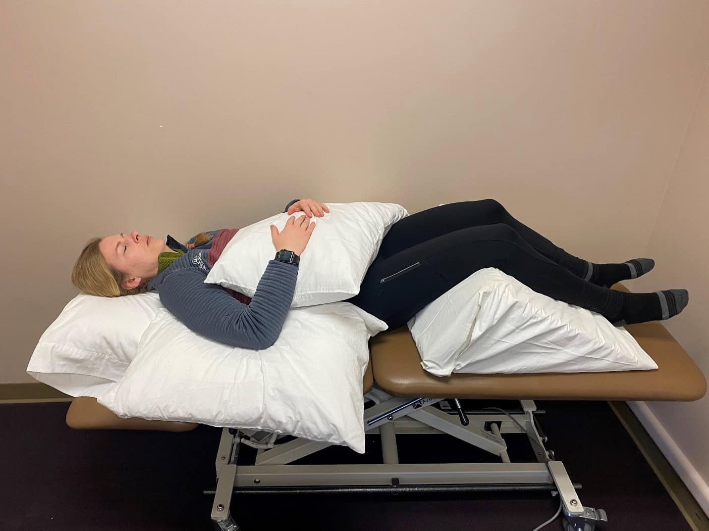 The goal is to keep your spine and neck in neutral alignment. Start by placing a pillow or wedge underneath the knees to allow the lower back to lay flat. Use a pillow that keeps the neck in a neutral position (not too high and not too low). Small pillows may be placed underneath each elbow for support to maintain neutral alignment of the arms and shoulders. A small pillow may be placed underneath the wrists and hands to help maintain a neutral position.